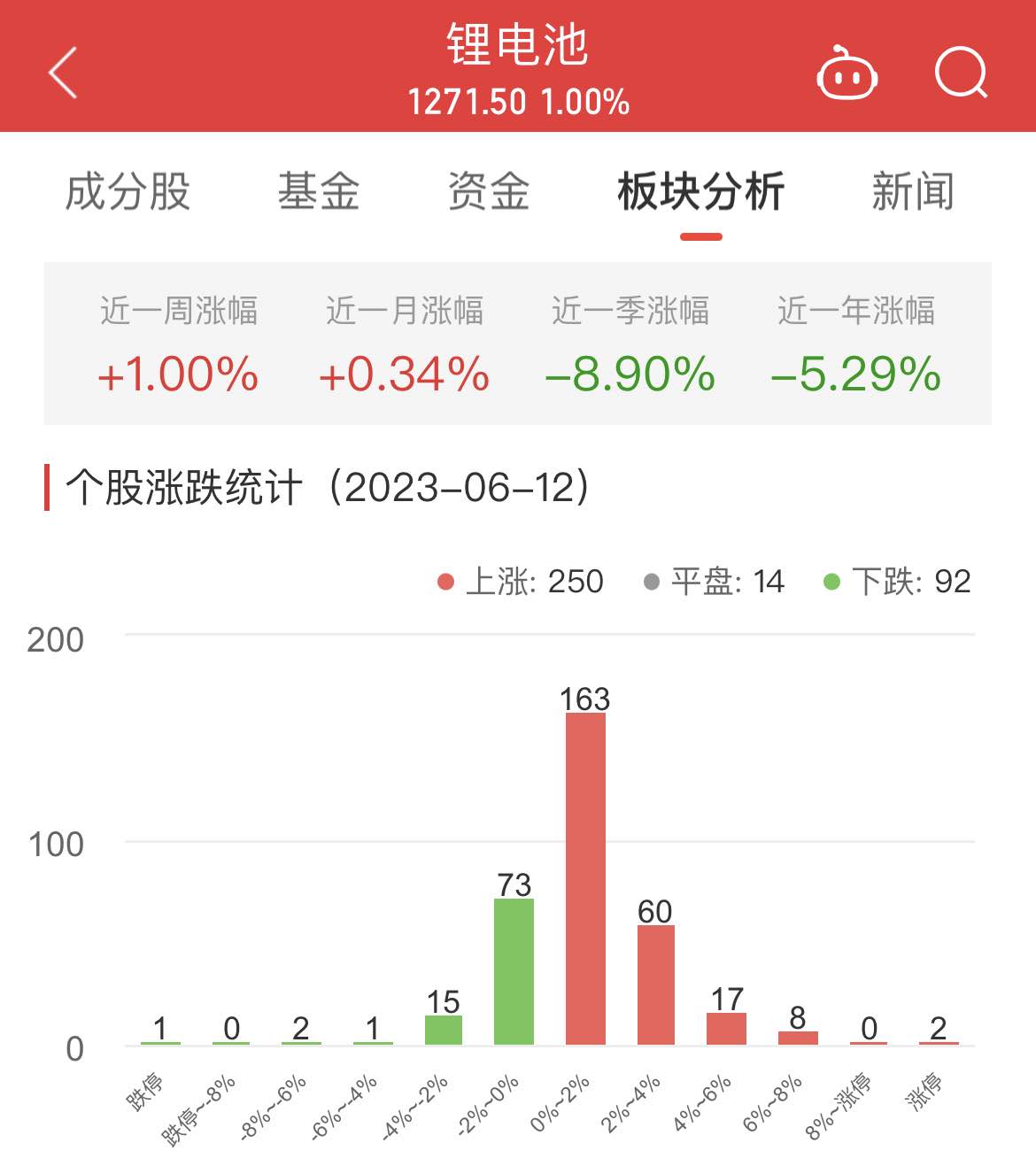 中国经济网北京6月12日讯今日,锂电池板块整体涨幅1.00%,其中250只股票上涨,14只股票平盘,92只股票下跌。