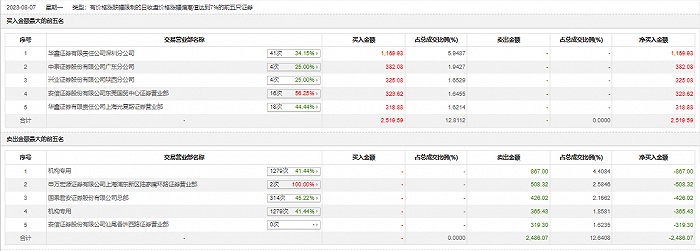 8月7日,宏辉果蔬今日涨停,龙虎榜数据显示,上榜营业部席位全天成交5005.66万元,占当日总成交金额比例为25.45%。其中,买入金额为2519.59万元,卖出金额为2486.07万元,合计净买入33.52万元。