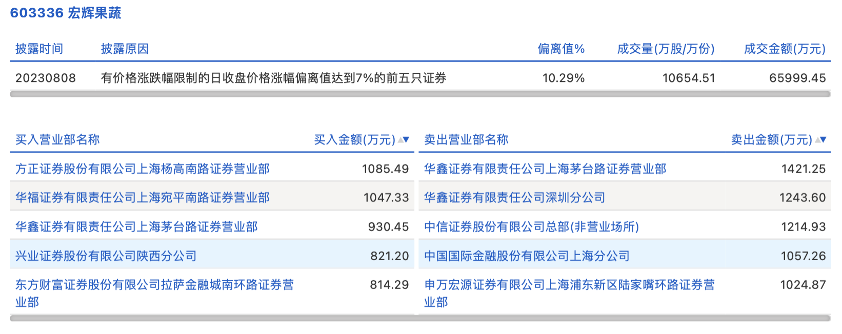8月8日,宏辉果蔬今日涨停,龙虎榜数据显示,上榜营业部席位全天成交1.07亿元,占当日总成交金额比例为16.15%。其中,买入金额为4698.76万元,卖出金额为5961.91万元,合计净卖出1263.15万元。