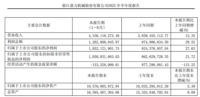 报告显示,浙江鼎力公司上半年营业收入为43.36亿元,同比增长12.35%;归母净利润为10.52亿元,同比增长27.63%;扣非归母净利润为10.50亿元,同比增长21.72%;基本每股收益2.08元。