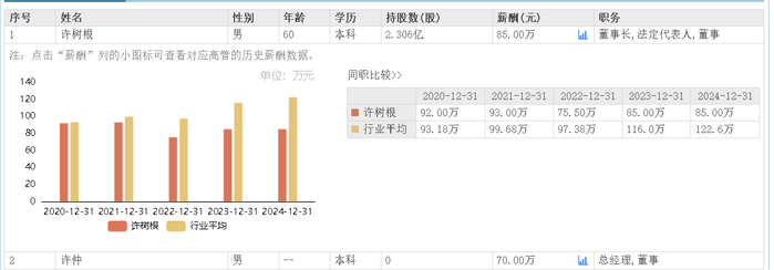 据东方财富网数据,浙江鼎力董事长许树根2024年领薪85万元,总经理许仲同年领薪70万元。