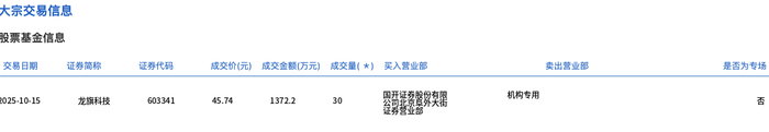 10月15日,龙旗科技大宗交易成交30万股,成交额1372.2万元,占当日总成交额的2.51%,成交价45.74元,较市场收盘价46.2元折价1%。