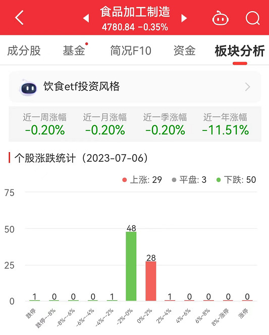中国经济网北京7月6日讯 今日,食品加工制造板块整体跌幅0.35%,其中,29只股票上涨,3只股票平盘,50只股票下跌。