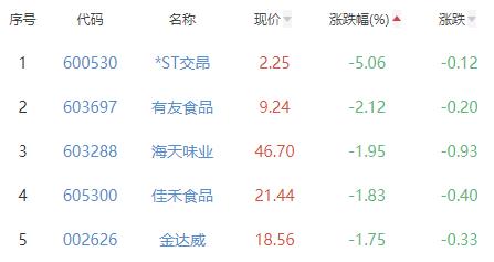 *ST交昂、有友食品、海天味业、佳禾食品、金达威位列涨幅榜后五位,涨幅分别为-5.06%、-2.12%、-1.95%、-1.83%、-1.75%。