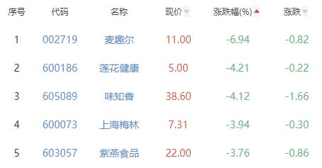 麦趣尔、莲花健康、味知香、上海梅林、紫燕食品位列涨幅榜后五位,涨幅分别为-6.94%、-4.21%、-4.12%、-3.94%、-3.76%。
