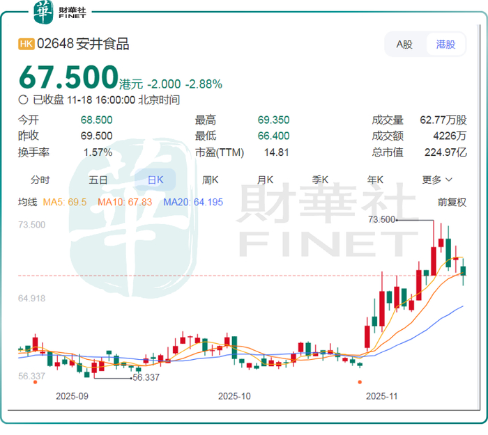 自10月末以来,安井食品迎来一波凌厉的上涨行情,尽管近期股价有所调整,但累计涨幅(包括港、A两市)仍超过15%,这也彰显了市场对这家“冻品一哥”的价值认可。