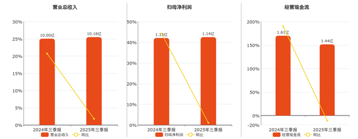 公司营业总收入为10.18亿元。归母净利润为1.14亿元。经营活动现金净流入为1.44亿元,较去年同报告期经营活动现金净流入减少1742.50万元,同比较去年同期下降10.81%。