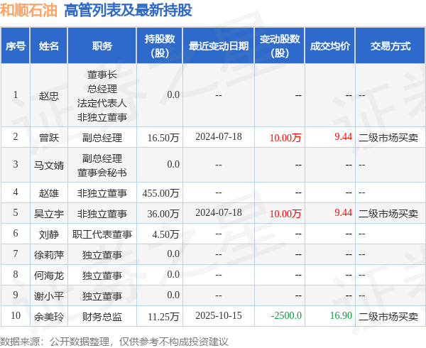 证券之星消息,根据10月20日市场公开信息、上市公司公告及交易所披露数据整理,和顺石油(603353)最新董监高及相关人员股份变动情况:2025年10月17日公司高级管理人员余美玲共减持公司股份1.25万股,占公司总股本为0.0073%。变动期间公司股价上涨4.99%,10月17日当日收盘报17.9元。