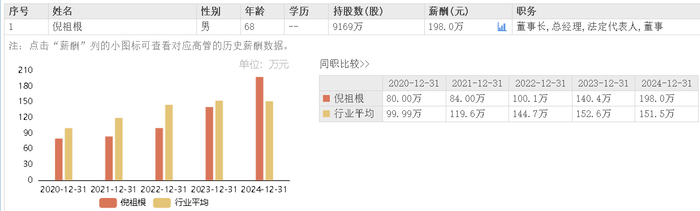据东方财富网数据,莱克电气董事长兼总经理倪祖根2020-2024年所获薪酬分别为80万、84万、100.1万、140.4万和198万元,连续四年涨薪。