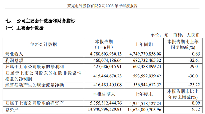 报告显示,莱克电气公司上半年营业收入为47.81亿元,同比增长0.65%;归母净利润为4.28亿元,同比下降29.01%;扣非归母净利润为4.15亿元,同比下降30.01%;基本每股收益0.75元。