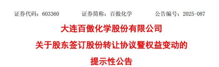 瑞财经 钟鸣辰 11月26日,百傲化学(SH603360)发布股份转让公告,宣布通运投资、光曜致新分别向刘红军转让5%股份,交易总额达9.93亿元。