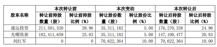 转让后,通运投资持股降至17627.03万股,占比24.96%;光曜致新持股降至14710.05万股,占比20.83%;刘红军将持有7062.24万股,占比10.00%。转让价格为每股28.12元,协议转让对价各为9.93亿元,价款支付方式为分期付款。