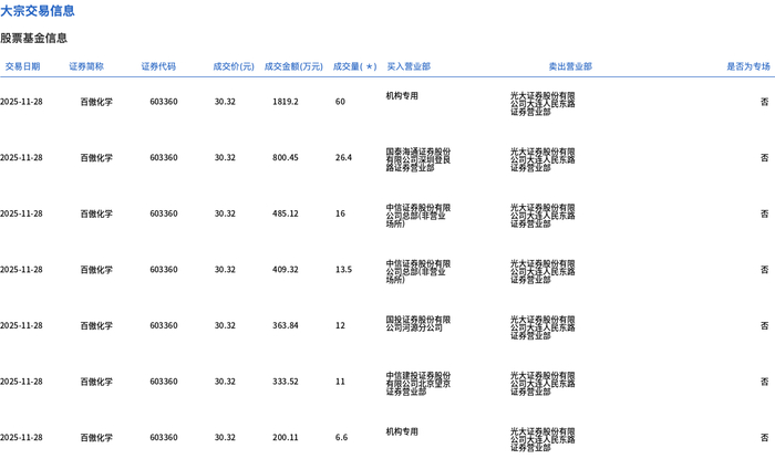 11月28日,百傲化学大宗交易成交145.5万股,成交额4411.56万元,占当日总成交额的7.87%,成交价30.32元,较市场收盘价33.75元折价10.16%。