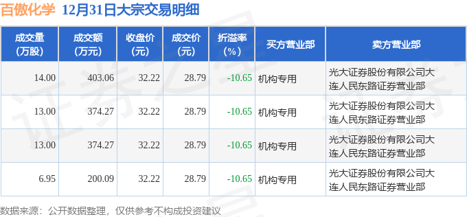 12月31日百傲化学现4笔折价10.65%的大宗交易 合计成交1351.69万元