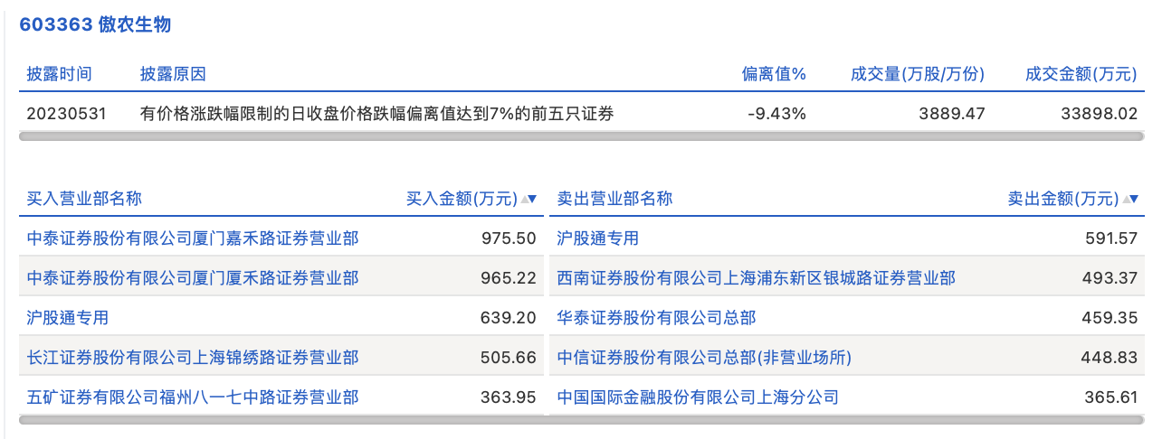 5月31日,傲农生物今日跌停,龙虎榜数据显示,上榜营业部席位全天成交5808.27万元,占当日总成交金额比例为17.13%。其中,买入金额为3449.54万元,卖出金额为2358.73万元,合计净买入1090.81万元。