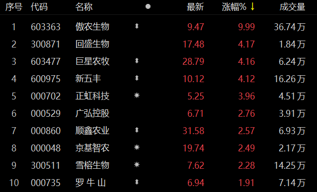 上证报中国证券网讯 6月1日,猪肉股震荡走高,截至13:18,傲农生物午后涨停,巨星农牧、新五丰、正虹科技等跟涨。