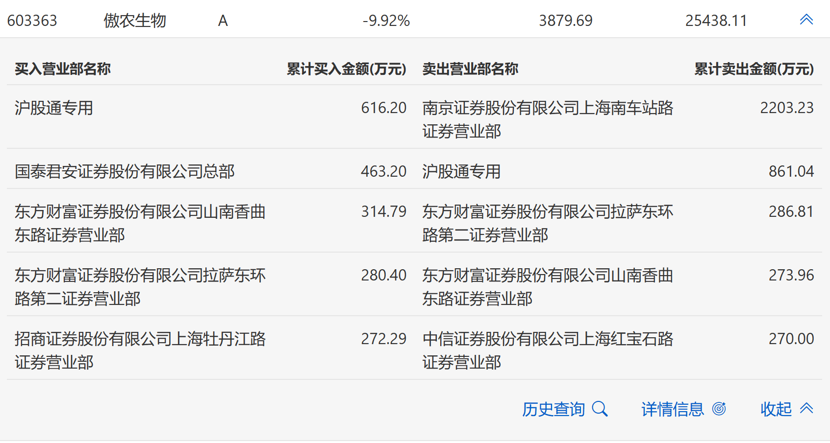 12月21日,傲农生物今日跌9.34%,全天换手率达5.26%,振幅达7.11%。龙虎榜数据显示,营业部席位合计净卖出1948.16万元。其中,南京证券上海南车站路证券营业部、沪股通专用分别卖出2203.23万元、861.04万元;沪股通专用、国泰君安证券总部分别买入616.20万元、463.20万元。