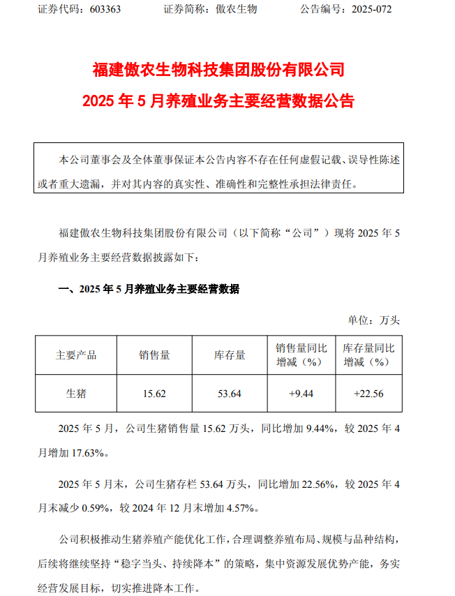 6月9日,傲农生物(603363.SH)公告称,2025年5月公司生猪销售量为15.62万头,同比增加9.44%,较2025年4月增加17.63%。5月末,公司生猪存栏53.64万头,同比增加22.56%,较2025年4月末减少0.59%,较2024年12月末增加4.57%。