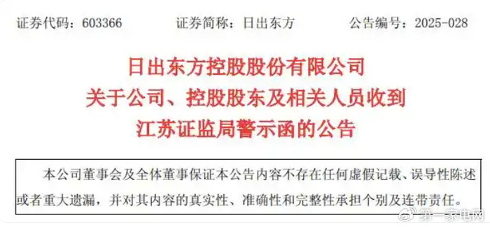 江苏证监局指出,日出东方上述行为违反了相关规定,公司董事长徐新建、总经理万旭昶、财务总监徐忠、时任董事会秘书丁玮,未能勤勉尽责。江苏证监局决定对日出东方控股股份有限公司、太阳雨控股集团有限公司、徐新建、万旭昶、徐忠、丁玮采取出具警示函的行政监管措施,并记入证券期货市场诚信档案。