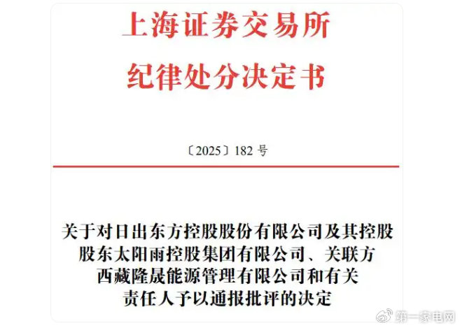 同日,上交所公告称,因日出东方全资子公司向关联方西藏隆晟能源管理有限公司提供借款累计2758.63万元,违反上市公司资金往来监管要求及股票上市规则。上交所作出如下纪律处分决定:对日出东方控股股份有限公司、控股股东太阳雨控股集团有限公司、关联方西藏隆晟能源管理有限公司、时任董事长徐新建、时任总经理万旭昶、时任财务总监徐忠、时任董事会秘书丁玮予以通报批评。