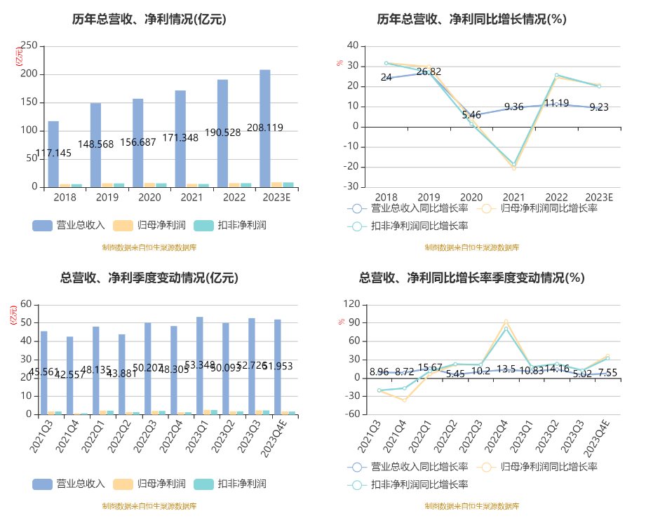 中证智能财讯 柳药集团(603368)3月19日晚间披露2023年业绩快报,公司实现营业收入208.12亿元,同比增长9.23%;归母净利润8.47亿元,同比增长20.7%;扣非净利润8.34亿元,同比增长20.01%;基本每股收益2.34元,加权平均净资产收益率为13.41%。以3月19日收盘价计算,柳药集团目前市盈率(TTM)约为9.1倍,市净率(LF)约1.23倍,市销率(TTM)约0.38倍。