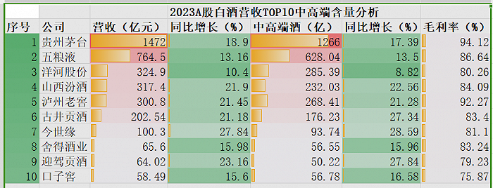 比如,五粮液(000858.SZ)营收站上800亿(含其他收入,白酒收入764.5亿),山西汾酒(600809.SH)、泸州老窖(000568.SZ)营收站上300亿,古井贡酒(000596.SZ)站上200亿,今世缘(603369.SH)站上100亿。