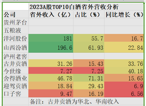 除了茅五泸这三家一线公司没有特别标注省份收入外,头部公司中山西汾酒、洋河股份省外收入也已超过省内,分别占比61.93%、55.7%。令人意外的是,舍得酒业(600702.SH)省外收入占比竟然高达71.31%,已称得上是全国性品牌。