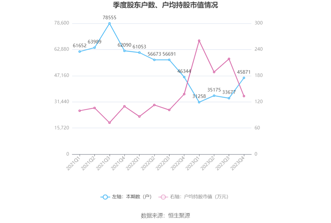 筹码集中度方面,截至2023年年末,公司股东总户数为4.59万户,较三季度末增长了1.22万户,增幅36.21%;户均持股市值由三季度末的218.55万元下降至133.32万元,降幅为39.00%。