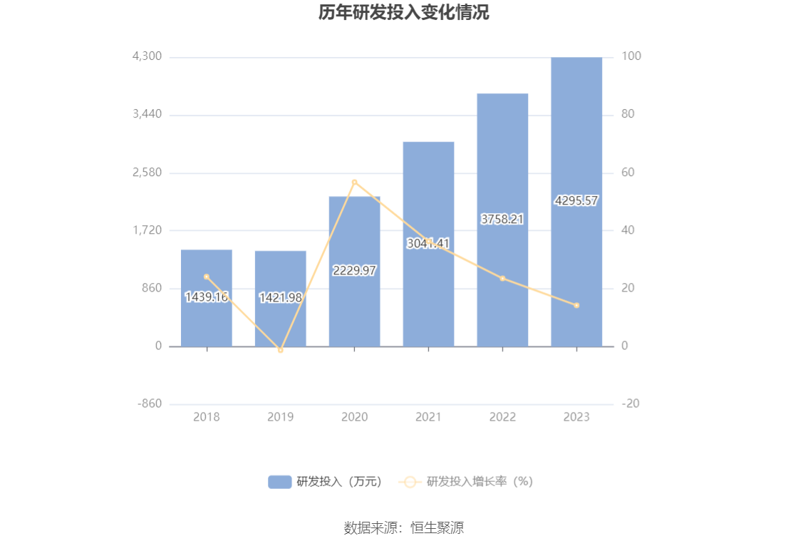 2023年全年,公司研发投入金额为4295.57万元,同比增长14.30%;研发投入占营业收入比例为0.43%,相比上年同期下降0.05个百分点。此外,公司全年研发投入资本化率为0。