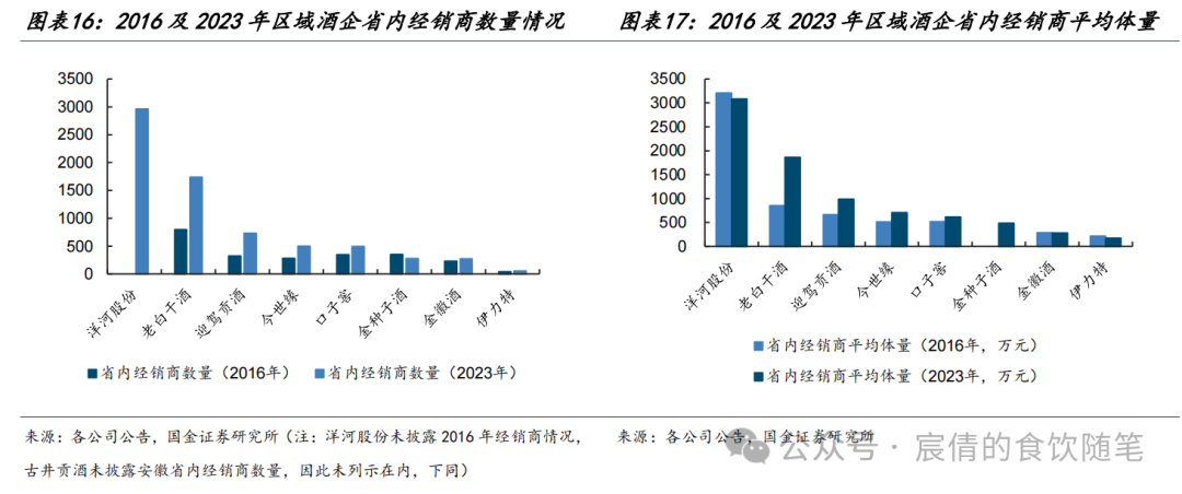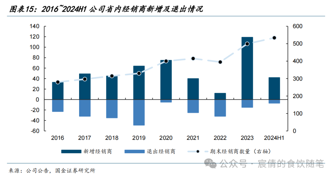 例如,公司2023年省内净增加104个经销商(作为参考,2017~2022年公司省内累计净增加经销商107个,2023年招商步伐明显加速),其中体量居前的淮安大区(淮安+宿迁)、南京大区(南京+镇江)分别净增加54、17个经销商。