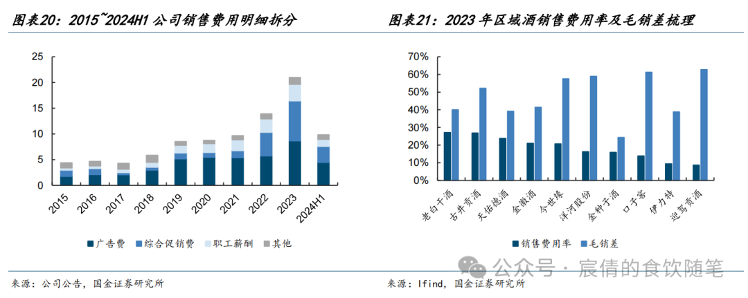 再者,公司2022/2023年销售费用为13.9/21.0亿元,同比+44%/+51%,主要系综合促销费大幅提升(2021~2023年该项目金额分别1.4/4.6/7.8亿元),源于公司加大对BC端红包联动等促销以调动消费积极性,叠加公司优化兑付流程所致。同时,渠道也反馈近两年公司加大对商超等流通渠道陈列等政策投入,消费端扫码红包、宴席政策投入、演唱会等常规营销活动也持续开展。