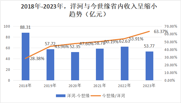 与此同时,今世缘省内收入占洋河省内收入的比例从最低的28.4%上升至63.4%。这一比例在今年中报时创下68.2%的新高。