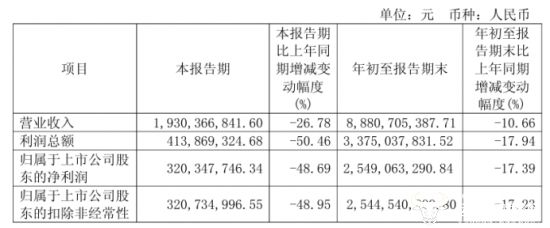 三季度财报显示,今世缘前三季度实现营业收入88.81亿元,同比下降10.66%,归母净利润为25.49亿元,同比下降17.39%。其中第三季度公司营业收入为19.30亿元,同比下滑26.78%,归母净利润同比下降48.69%至3.20亿元。
