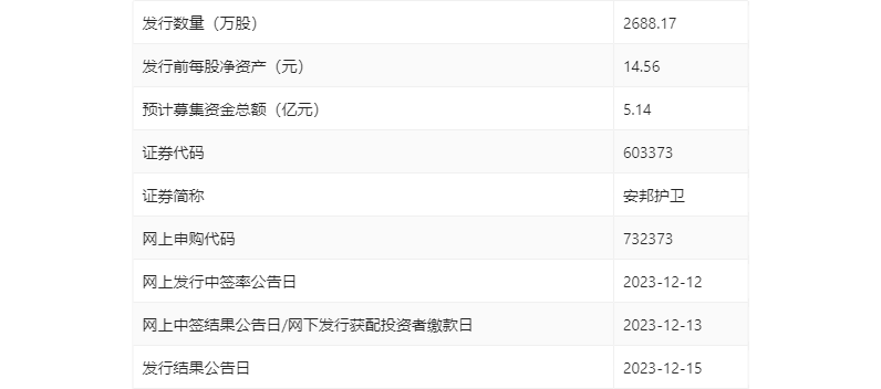 安邦护卫:拟首发募资4.72亿元投建浙江公共安全服务中心等项目 12月11日申购