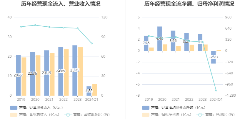 2024年第一季度,公司营业收入现金比为80.29%,净现比为-1131.89%。