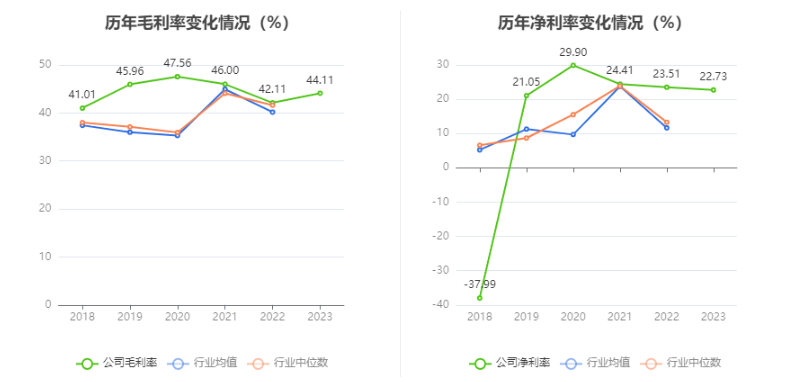 2023年,公司毛利率为44.11%,同比上升2.00个百分点;净利率为22.73%,较上年同期下降0.78个百分点。从单季度指标来看,2023年第四季度公司毛利率为43.19%,同比上升0.65个百分点,环比上升1.14个百分点;净利率为25.55%,较上年同期上升0.84个百分点,较上一季度上升7.44个百分点。