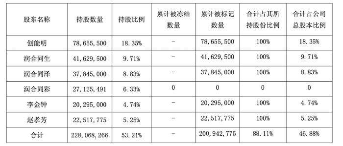 例如,因与中财招商投资集团商业保理有限公司存在约1.5亿元的保理合同纠纷,创能明、李金钟及其一致行动人润合同生需承担连带保证责任,其所持有的合计1.4亿股公司股份已于今年5月被司法冻结。