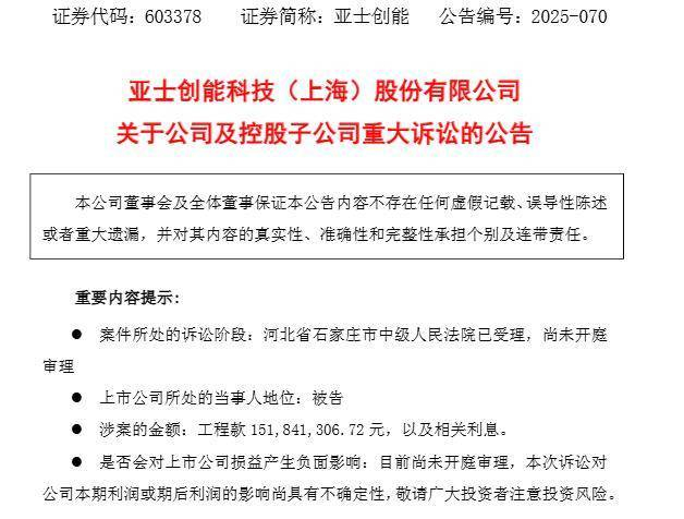 亚士创能及子公司涉重大诉讼 被诉欠付1.51亿元工程款