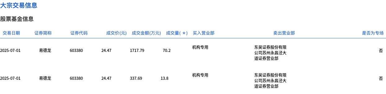 易德龙今日大宗交易折价成交84万股,成交额2055.48万元