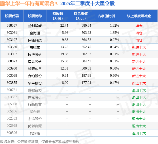 鹏华上华一年持有期混合A的前十大重仓股如下:
