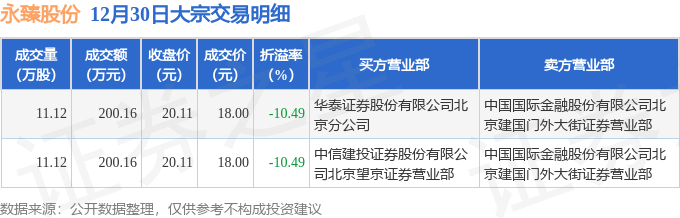 12月30日永臻股份现2笔折价10.49%的大宗交易 合计成交400.32万元