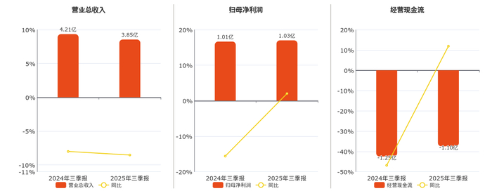 公司营业总收入为3.85亿元,较去年同报告期营业总收入减少3587.74万元,同比较去年同期下降8.53%。归母净利润为1.03亿元。经营活动现金净流入为-1.10亿元。