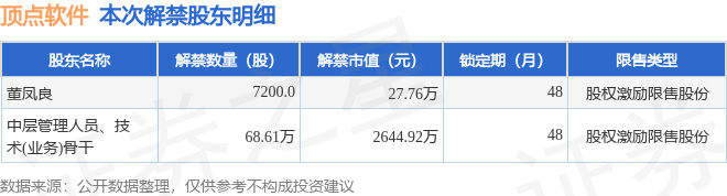 证券之星消息,根据市场公开信息整理,顶点软件(603383)于12月16日将有69.33万股限售股份解禁,为公司股权激励限售股份,占公司总股本0.34%。(本次数据根据历史公告整理得出,实际情况以上市公司最新公告为准)最近一年内,该股累计解禁88.82万股,占总股本的0.43%。本次解禁后,公司还有2700.0股限售股份,占总股本0.0%。具体如下图所示: