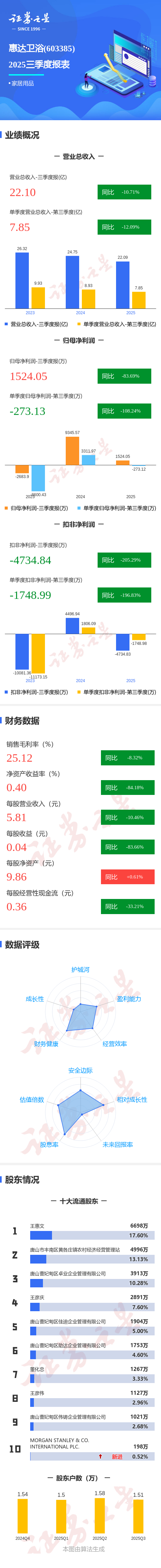 图解惠达卫浴三季报:第三季度单季净利润同比下降108.25%