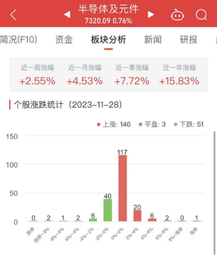 中国经济网北京11月28日讯今日,半导体及元件板块整体涨幅0.76%,其中146只股票上涨,3只股票平盘,51只股票下跌。