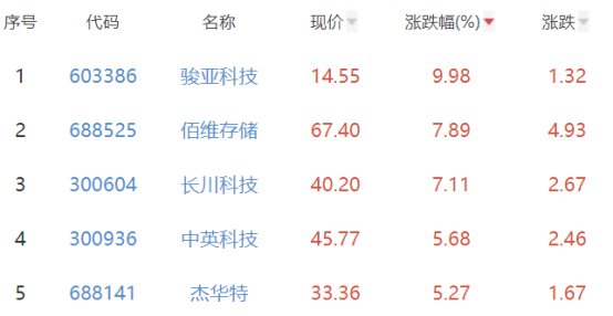 其中,骏亚科技、佰维存储、长川科技、中英科技、杰华特位列板块涨幅前五位,涨幅分别为9.98%、7.89%、7.11%、5.68%、5.27%。