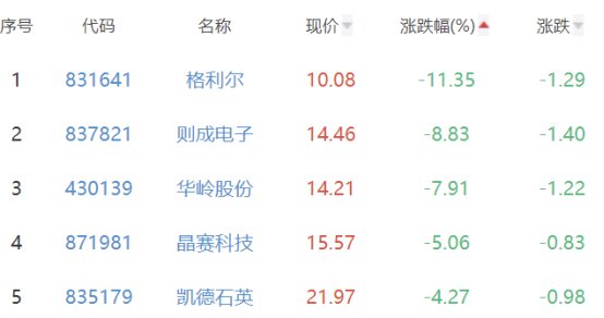 格利尔、则成电子、华岭股份、晶赛科技、凯德石英位列涨幅榜后五位,涨幅分别为-11.35%、-8.83%、-7.91%、-5.06%、-4.27%。