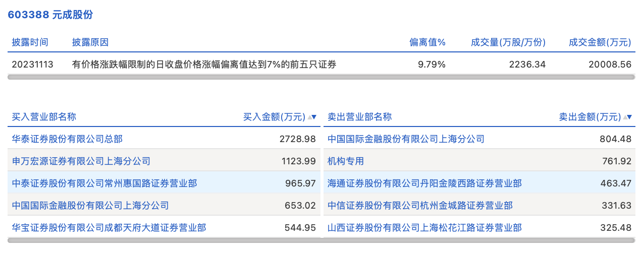 11月13日,元成股份今日涨停,全天换手率达6.87%,振幅达8.34%。龙虎榜数据显示,营业部席位合计净买入3329.92万元。其中,机构合计净卖出761.92万元。此外,华泰证券总部、申万宏源证券有限公司上海分公司分别买入2728.98万元、1124万元;中国国际金融上海分公司、海通证券丹阳金陵西路证券营业部分别卖出804.48万元、463.47万元。
