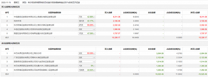 元成股份11月15日涨停,全天换手率达27.57%,振幅达12.15%。龙虎榜数据显示,营业部席位合计净买入4802.7万元。其中,机构合计净买入3130.46万元。此外,中信建投证券上海浦东南路证券营业部、东方财富证券上海东方路证券营业部分别买入6211.36万元、2252.20万元;申万宏源证券有限公司上海分公司、广发证券梅州大埔证券营业部分别卖出3894.89万元、2123.86万元。