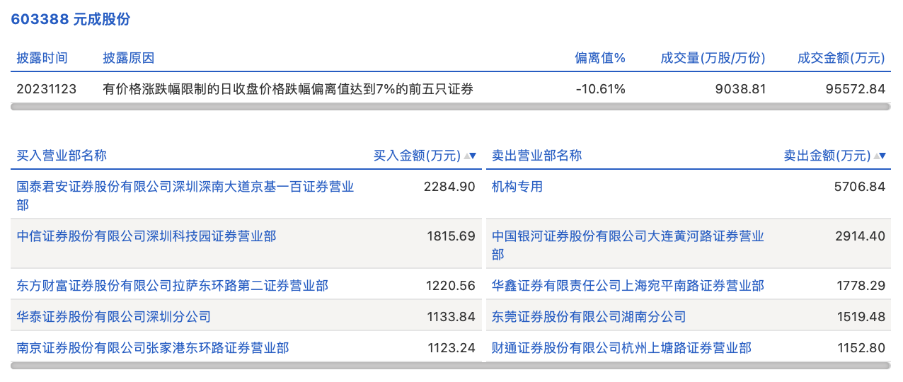 11月23日,元成股份今日跌停,龙虎榜数据显示,上榜营业部席位全天成交2.07亿元,占当日总成交金额比例为21.61%。其中,买入金额为7578.23万元,卖出金额为1.31亿元,合计净卖出5493.59万元。